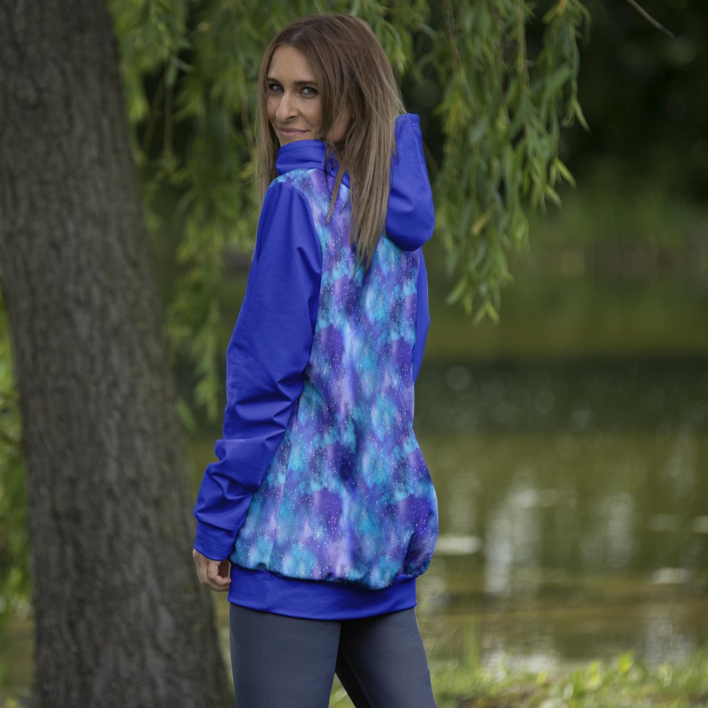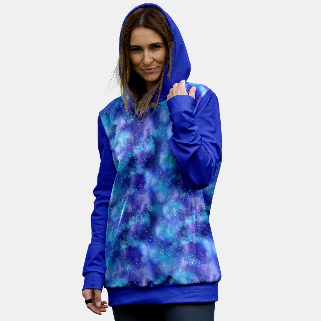 Tato dámská mikina vás zavede přímo do srdce kosmického oblaku s jejím hypnotizujícím galaktickým vzorem. Kombinace sytých odstínů modré s jemnými tóny fialové a záblesky bílých hvězd vytváří iluzi noční oblohy plné hvězd. Intenzivní modrá kapuce a rukávy krásně ladí s galaktickým motivem, dodávající mikině jednotný a odvážný vzhled. Vyrobena z pohodlného funkčního materiálu, tato mikina je nejen pohledná, ale i praktická, poskytuje teplou vrstvu pro chladnější večery nebo jako stylový doplněk pro každodenní dobrodružství.
