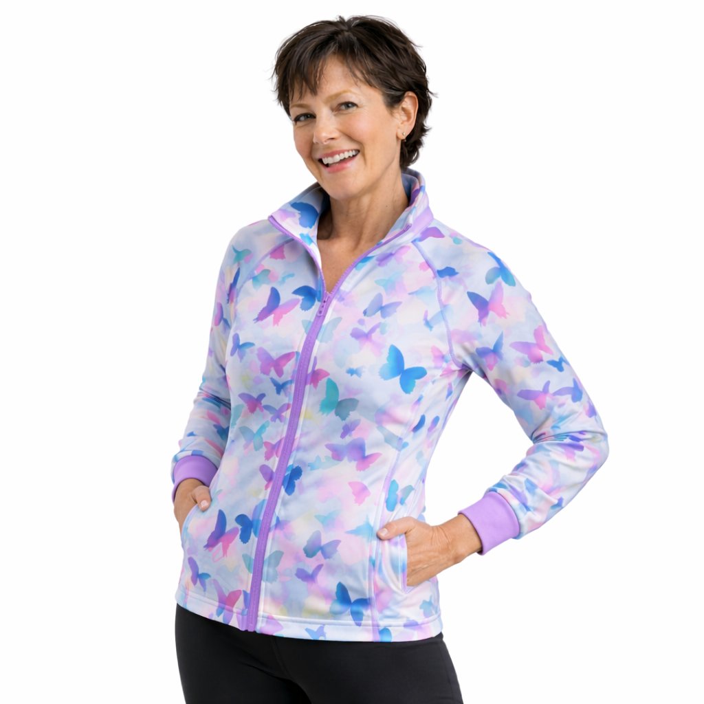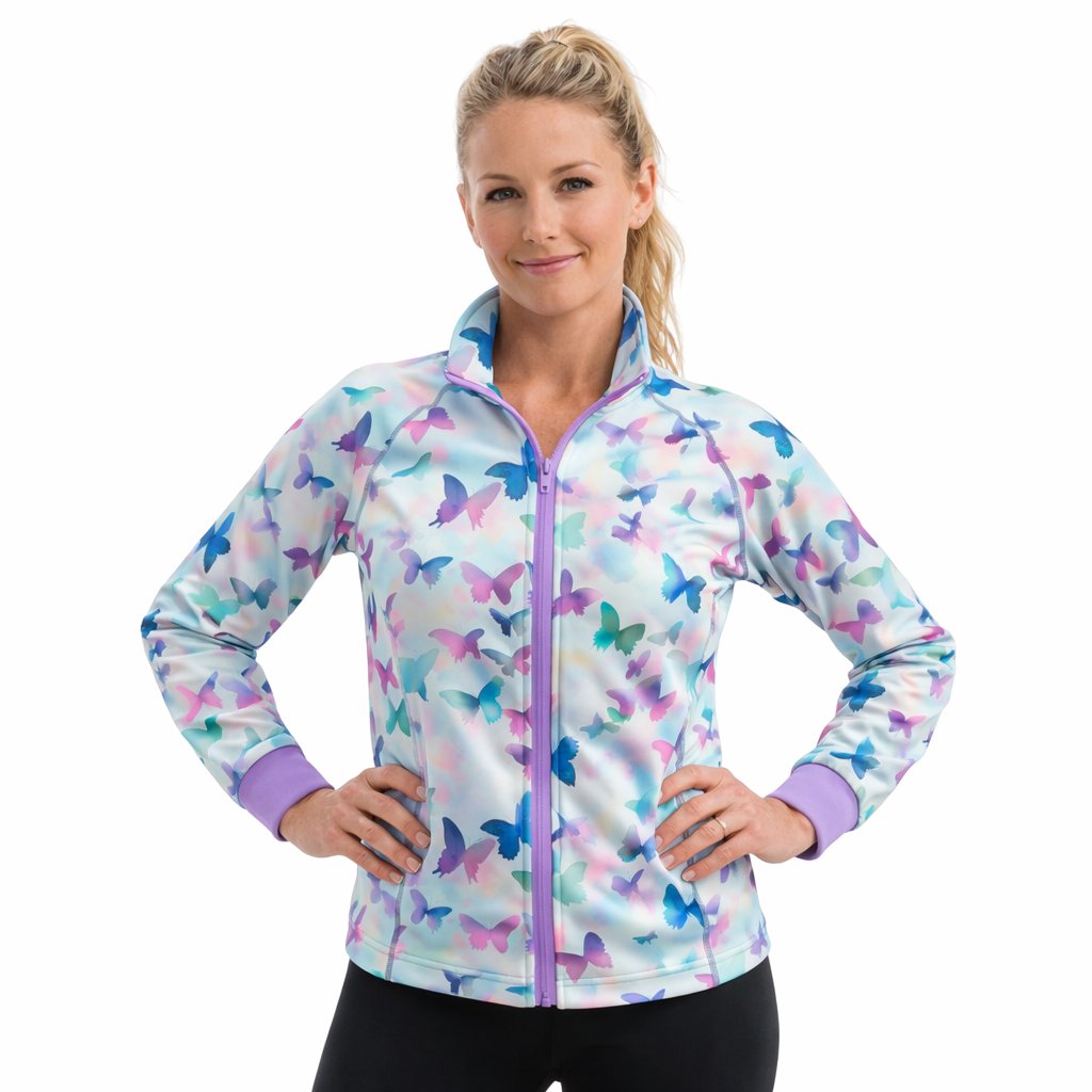 Dámská mikina Mishino „Motýlí sen“ je ztělesněním lehkosti, barev a radosti. Na jemném pastelovém podkladu poletují motýli v odstínech fialové, tyrkysové a růžové, čímž vytvářejí dojem pohybu a svobody. Tento romantický a pozitivní design rozzáří každý den a dodá vašemu outfitu hravý dotek. Mikina je ušitá z kvalitního, měkkého a elastického materiálu, který poskytuje výjimečné pohodlí. Zip po celé délce, stojáček a praktické kapsy zaručují funkčnost i styl. Ideální volba pro ženy, které milují jemnost a barvy života.