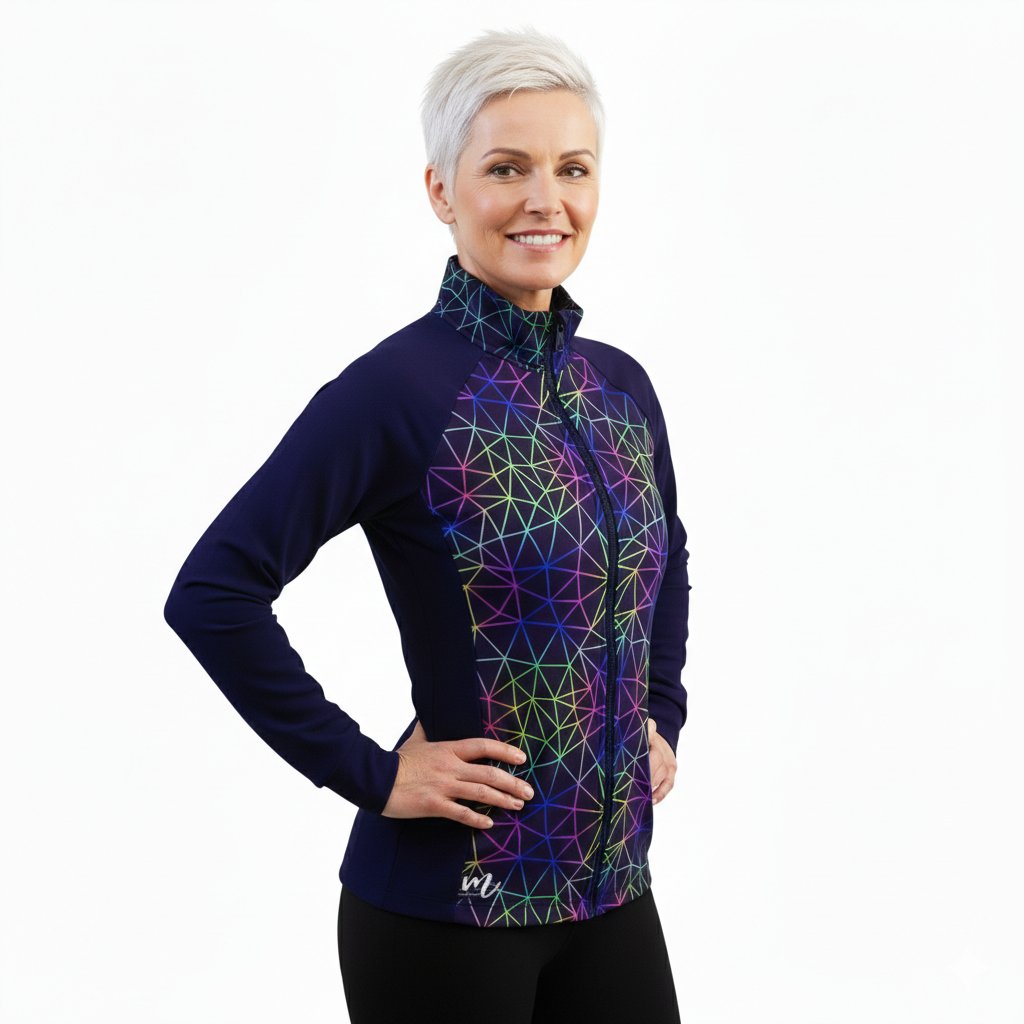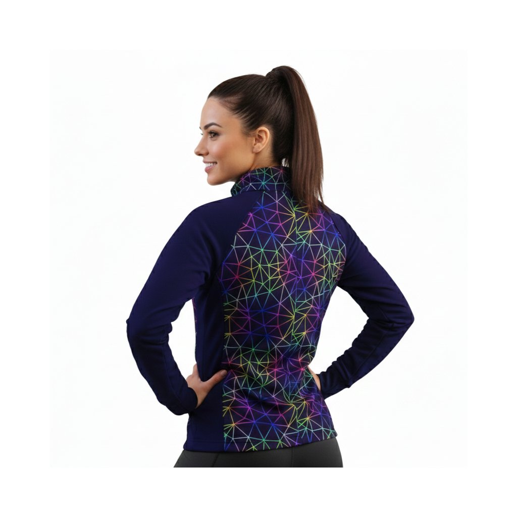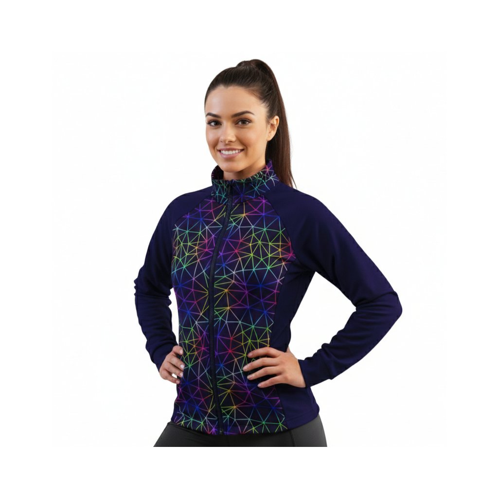 Design „Noční spektrum“ oslavuje futuristickou estetiku v kombinaci s živou energií neonových barev. Na černém podkladu vystupuje síť geometrických linií, které vytvářejí duhově zbarvené trojúhelníkové vzory – jako světelná show ve městě, které nikdy nespí. Tento výrazný a moderní motiv je ideální pro ženy, které milují originalitu, technologický styl a výrazné kontrasty. Mikina působí stylově, odvážně a perfektně se hodí jak do města, tak na večerní akce či koncerty.