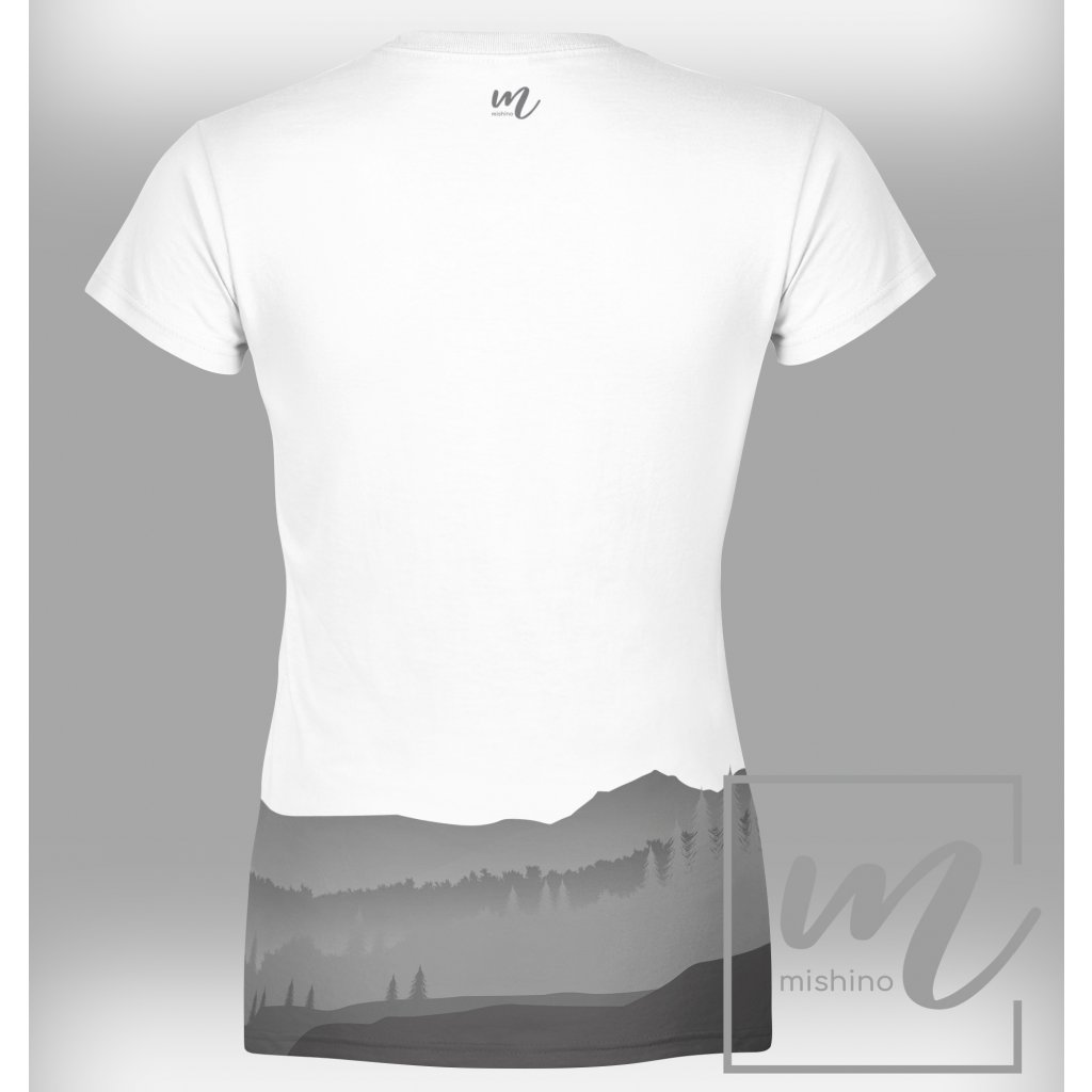 Toto dámské tričko "Mishino Monochrome Mountain" vyniká minimalistickým černobílým designem s jemnou siluetou horské krajiny na spodním lemu. Nad horami je umístěno logo Mishino s dodatkem "Czech sportswear since 2003", což zdůrazňuje dlouholetou tradici značky.