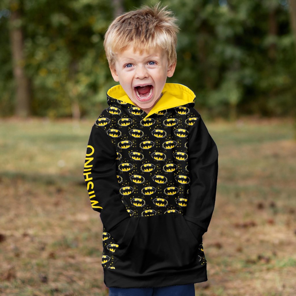Chlapecká mikina Mishino "Noční Strážce" je určena pro malé hrdiny, kteří milují tajemství noci. S ikonickým potiskem netopýřích znaků na rukávech a kapse přináší tato mikina dobrodružnou atmosféru. Kontrastní kombinace černé a zářivě žluté vytváří odvážný a stylový vzhled, který přitáhne pozornost. Pohodlná kapuce a měkký materiál zaručují komfort, zatímco prostorná klokaní kapsa je ideální pro uložení drobných pokladů.