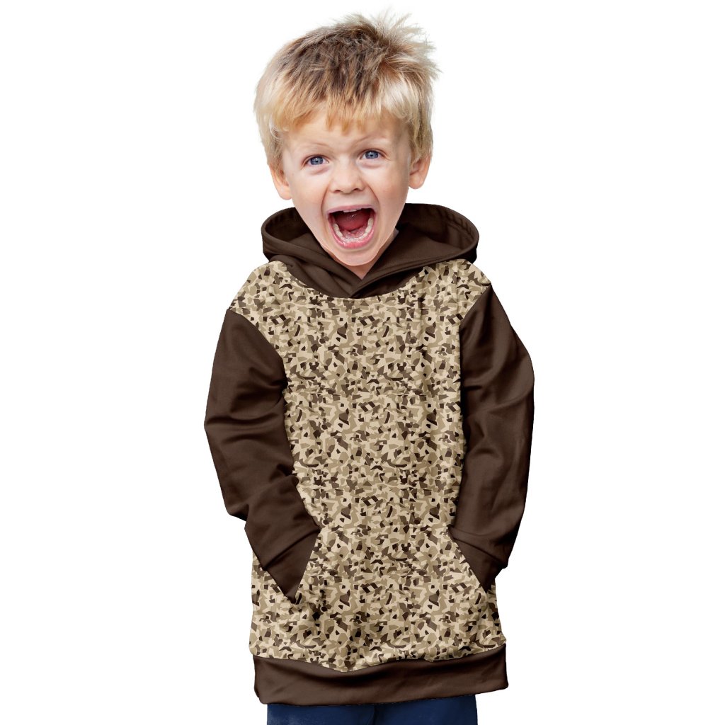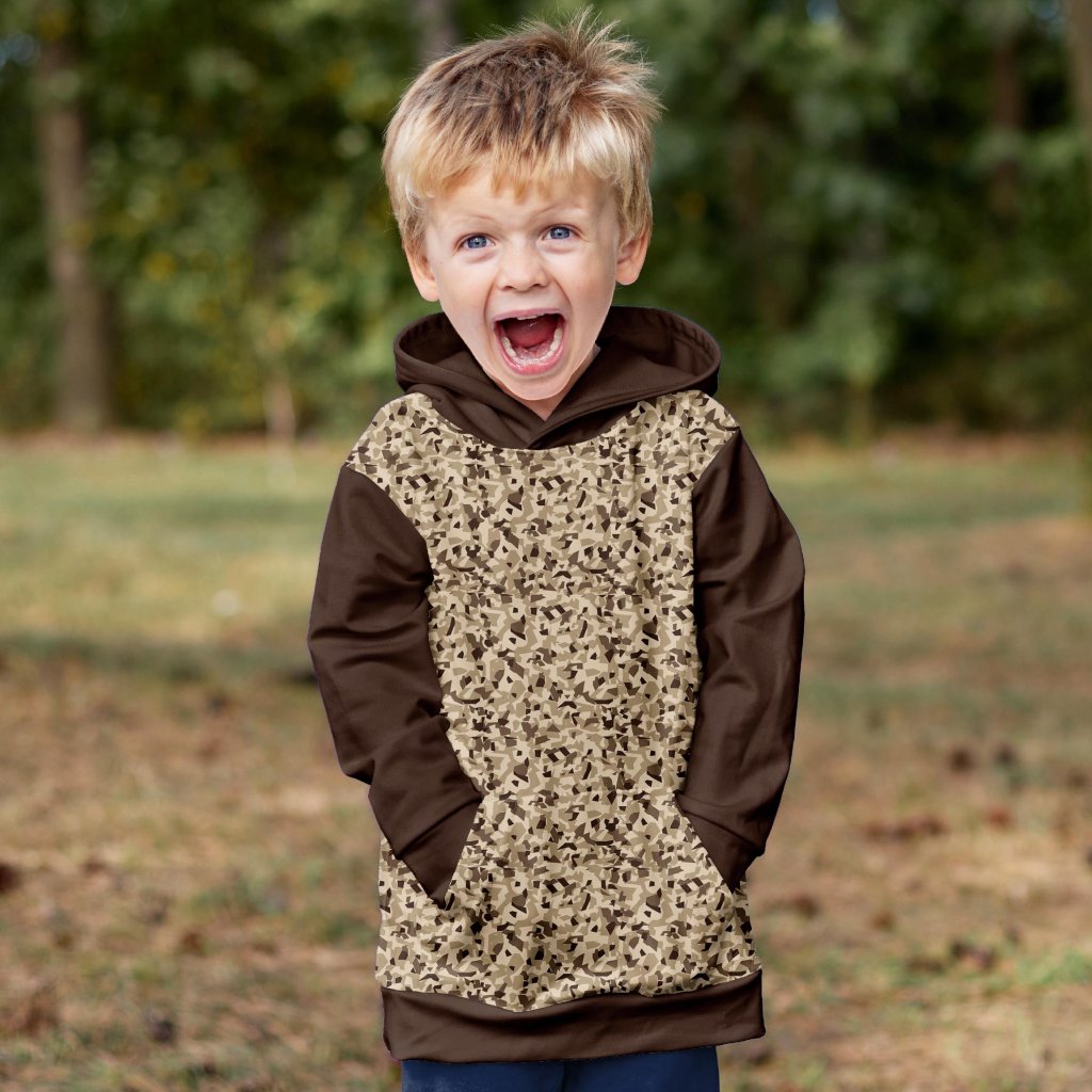 Chlapecká mikina Mishino "Hnědý Maskáč" přináší klasický maskovací vzor v odstínech hnědé, ideální pro malé dobrodruhy, kteří milují přírodu a akci. Kombinace hnědých rukávů a kapuce s maskáčovým předním panelem dodává mikině stylový, ale zároveň praktický vzhled. Měkký materiál a pohodlný střih zajišťují komfort během všech aktivit, zatímco prostorná klokaní kapsa je ideální pro ukládání drobností.