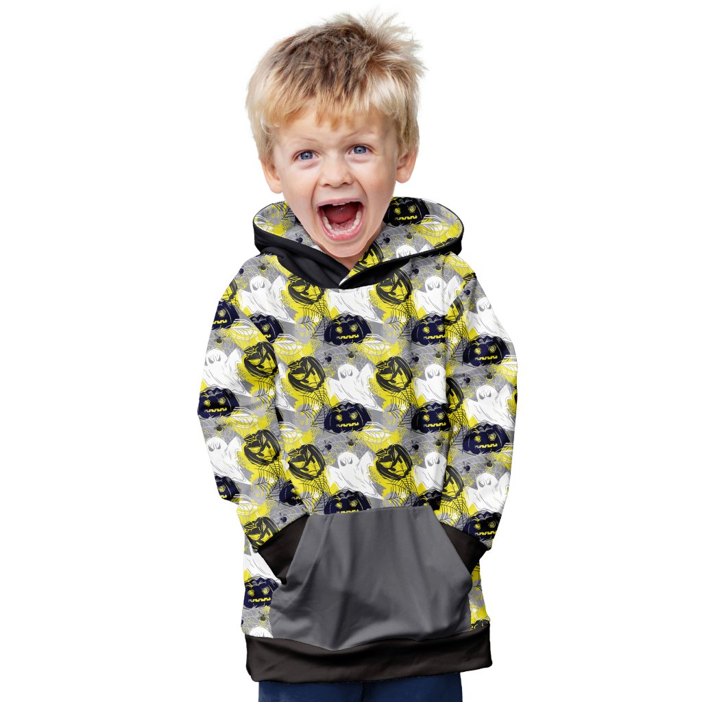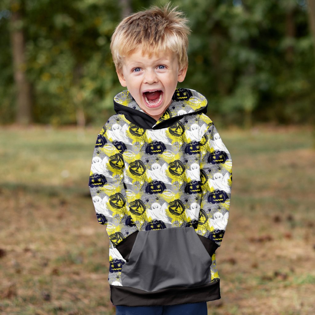 Chlapecká mikina Mishino "Halloweenový Duch" přináší hravý a strašidelný design s motivy duchů, netopýrů a dýní v odstínech žluté, černé a bílé. Tento tematický potisk je ideální pro malé milovníky Halloweenu a dobrodružství. Kontrastní šedá kapsa a černá kapuce dodávají mikině moderní vzhled, zatímco měkký materiál a prostorná klokaní kapsa zaručují pohodlí během každodenních aktivit.