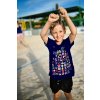 Dětské funkční tričko s veselým a barevným potiskem inspirovaným Slováckým létem 2024. Design obsahuje různé plážové motivy, letní ovoce, hudební nástroje a další symboly léta v pestrých barvách na tmavě modrém podkladu. Tričko je vyrobeno z prodyšného materiálu, ideální pro aktivní děti. Všechny trička jsou tištěná a ušitá v naší dílně.