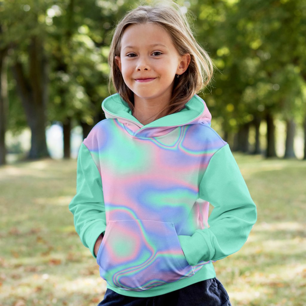 Dívčí mikina Mishino Duhový sen je jako pastelový sen proměněný ve stylový kousek. Přední část mikiny zaujme jemným abstraktním vzorem v pastelových odstínech růžové, modré a zelené, který připomíná třpytící se povrch duhy. Tyrkysové rukávy a kapuce dodávají celku svěží kontrast. Mikina je ideální pro dívky, které milují hravý a originální styl.
