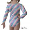 Tento gymnastický dres je zdobený vzorem duhových kostek, který připomíná digitální pixelovou mozaiku. Vzor vytváří iluzi trojrozměru a pohybu s jeho proplétáním mnoha barev v jasných odstínech, od růžové přes modrou až po zelenou. Vizuálně dynamický design je umocněný tím, že každá barva plynule přechází do další, což vytváří lákavý a veselý efekt. Materiál dresu je navržen tak, aby byl pružný a komfortní, což umožňuje gymnastce volný pohyb a je ideální pro trénink i soutěže.