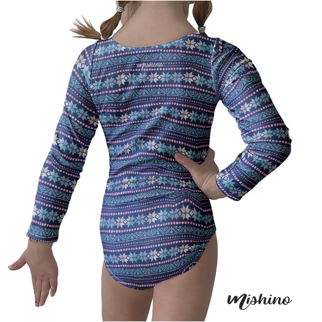 Tento gymnastický dres se může pochlubit tradičním norským vzorem, který kombinuje modré, bílé a růžové odstíny ve složitém a esteticky příjemném designu. Vzor tvoří horizontální pruhy, které jsou složeny z drobných geometrických tvarů a květinových motivů, připomínajících klasické pletené svetry. Dres je vyroben z pružného materiálu, který umožňuje gymnastce volnost pohybu a je dostatečně pohodlný pro dlouhé tréninky a výkony. Dlouhé rukávy poskytují ochranu a dodávají dresu eleganci, činíce ho ideálním pro sportovkyně, které hledají unikátní a tradiční vzhled.