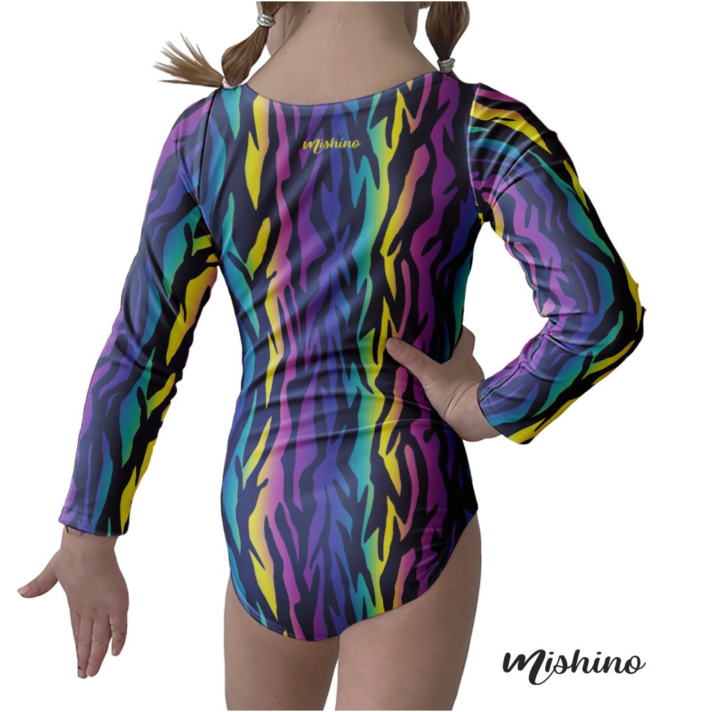 Dívčí gymnastický dres v nádherném designu. Tento dynamický gymnastický dres překypuje energií díky svému odvážnému vzoru inspirovanému zebrami, který je interpretován v paletě živých neonových barev. Vzor, který připomíná plameny nebo vlny, kombinuje elektrizující odstíny žluté, oranžové, fialové, modré a zelené, které se protínají a tvoří hypnotizující a poutavý efekt. Dlouhé rukávy a odolný, ale pružný materiál zajistí, že tento dres bude pohodlný při každém pohybu, zatímco jeho jedinečný design zaručí, že každá gymnastka bude ve středu pozornosti. Perfektní volba pro tréninky i soutěže, tento dres je stejně jedinečný jako je talent každé gymnastky, která jej nosí.