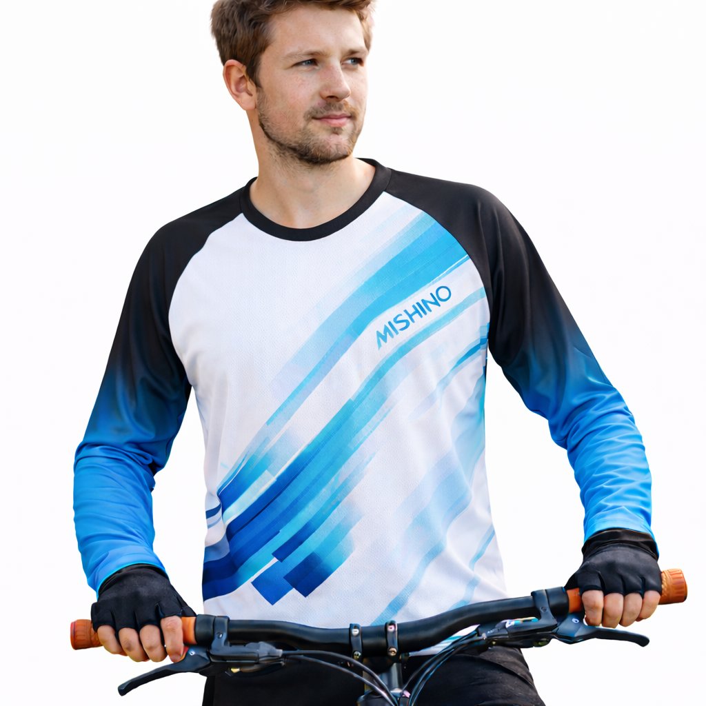 Mishino ALEX Ice Flow v sobě nese čistotu, rychlost a svěží energii. Ledově bílý základ doplňují šikmé modré proužky, které připomínají zrychlení, klid a precizní stopu. Rukávy s přechodem do černé vytvářejí kontrast a závodní akcent. Pro jezdce, kteří mají styl pod kontrolou.