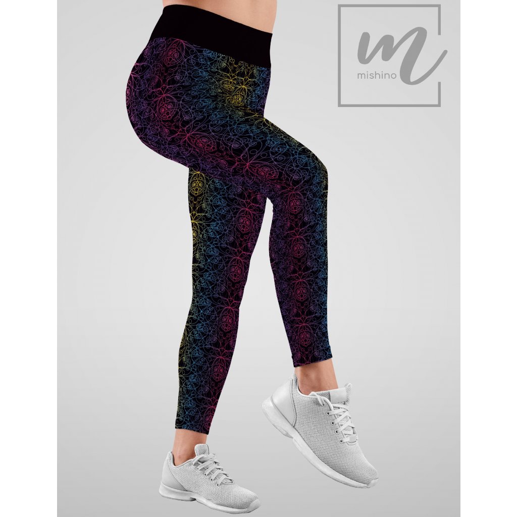 Legíny Mishino "Barevný Vír" představují výbuch barevné energie s kaleidoskopickým efektem. Tento komplexní vzor křivkujících linií a spirál se mění od tmavého pozadí k jasným neonovým akcentům, vytvářející efekt hloubky a dynamiky. Vhodné pro ženy, které chtějí do svého vzhledu přinést odvážný a umělecký prvek.