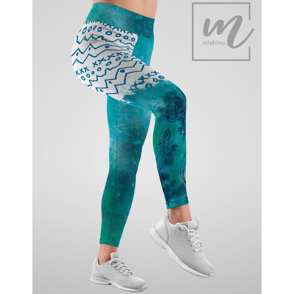 Legíny "Ještěří Zvlnění" od Mishino jsou inspirací z přírodního světa, především z říše plazů. Tento unikátní design v sobě snoubí živou tyrkysovou s bílými a světle modrými vzory, které připomínají tradiční plemenné tetování a ještěří kůži. Detaily v podobě ještěrek přidávají tomuto exotickému vzhledu hravost a originalitu. Kombinace barvy a vzoru je nejen esteticky příjemná, ale také dodává smysl pro pohyb a adaptabilitu, které jsou charakteristické pro ještěry. Legíny jsou dokonalé pro každodenní dobrodružství nebo pro rozličné fitness aktivity, kde můžete ukázat svůj divoký a nezkrotný duch.