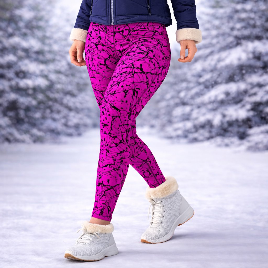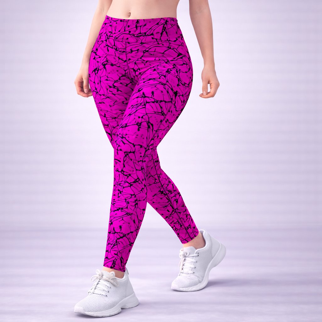 Legíny Mishino "Neonový Švih": Tyto legíny se vyznačují dynamickým vzorem abstraktních neonových čar na růžovém pozadí. Nepravidelný vzor připomínající rychlé škrty fixou či štětcem dodává legínám expresivní a moderní charakter, vhodný pro odvážné módní kombinace. Materiál je na dotek hladký a zdá se být dostatečně elastický pro komfortní nošení při jakékoliv fyzické aktivitě nebo volnočasovém odpočinku.
