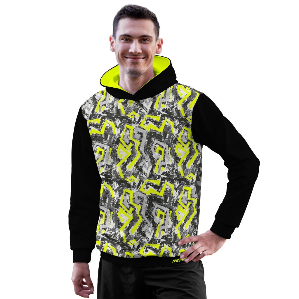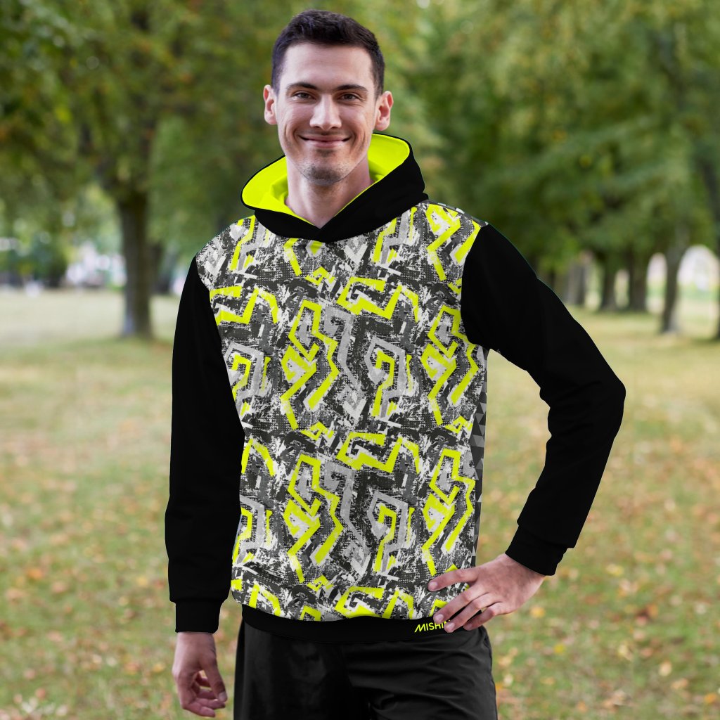 Pánská mikina MISHINO URBAN FLASH se vyznačuje moderním geometrickým vzorem v šedé, bílé a neonově žluté barvě. Černé rukávy a kapuce dodávají mikině výrazný kontrast a styl. Vertikální logo MISHINO podtrhuje jedinečný vzhled této mikiny. Mikina je český výrobek, vytištěná a ušitá v naší dílně, s důrazem na kvalitu a detail.