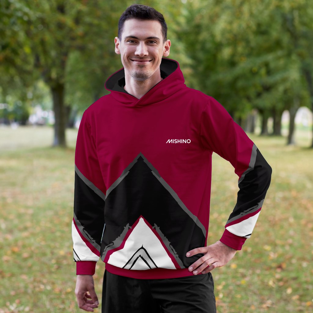 Tato červeno-černo-bílá mikina s kapucí zaujme odvážnými geometrickými tvary v podobě šipek, které dodávají dynamiku a moderní vzhled. Logo Mishino je umístěno na hrudi pro minimalistický efekt..