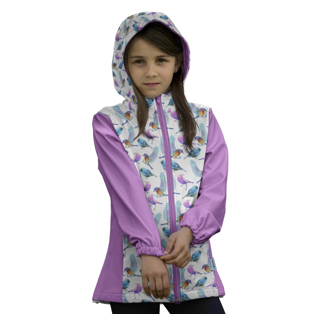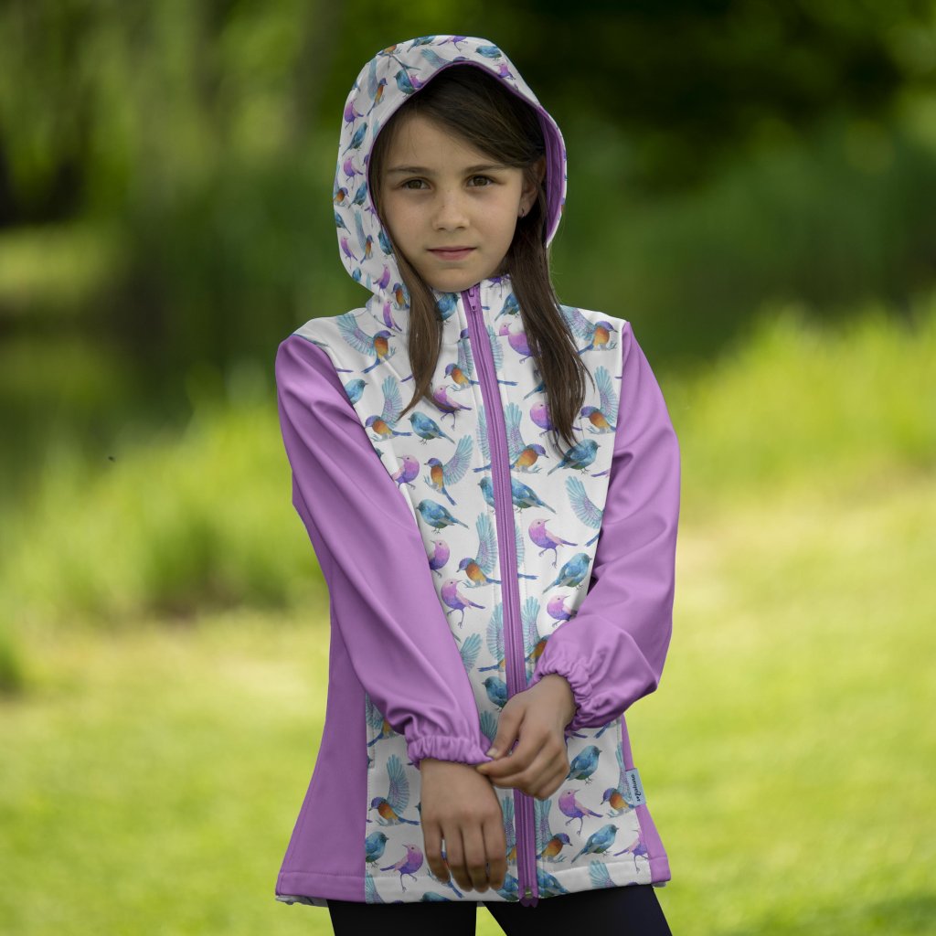 Tato dívčí softshellová bunda "Aquarelle Birds" je inspirována krásou přírody a jemnými akvarelovými tóny. S nápaditým potiskem pestrobarevných ptáčků a v jemném fialovém odstínu, tato bunda je tak krásná, jak je praktická. Nabízí voděodolný a prodyšný materiál, odnímatelnou kapuci a bezpečnostní reflexní prvky.