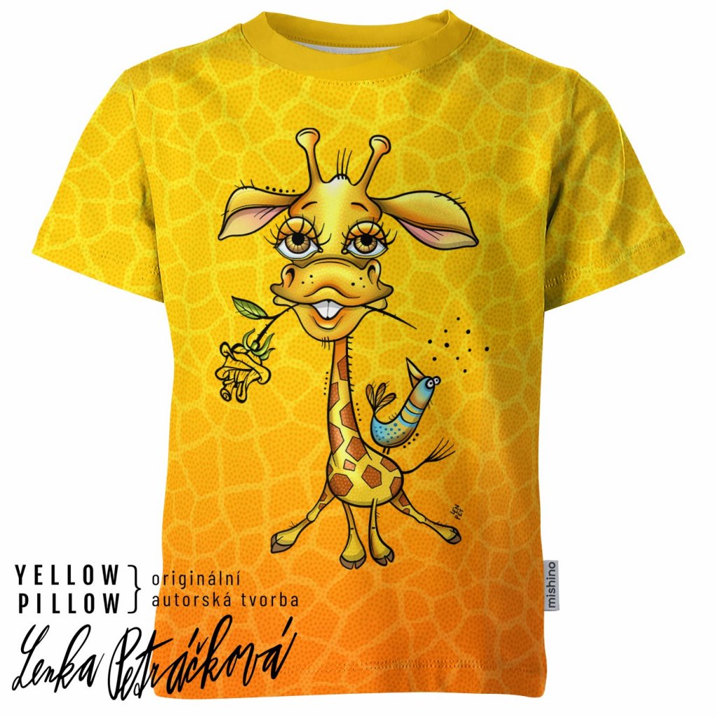 Design je umístěn na pozadí, které připomíná žirafí kůži, a jeho žlutá barva je jasná a přitažlivá, což je ideální pro dětské oblečení. Podpisová značka "Yellow Pillow" a jméno "Lenka Petráčková" zdůrazňují, že se jedná o originální autorskou tvorbu, a zaručují, že oblečení je nejen jedinečné, ale také že podporuje místní umělce. Toto tričko je perfektní pro malé děti, které chtějí být stylové, zatímco prozkoumávají svět kolem sebe.