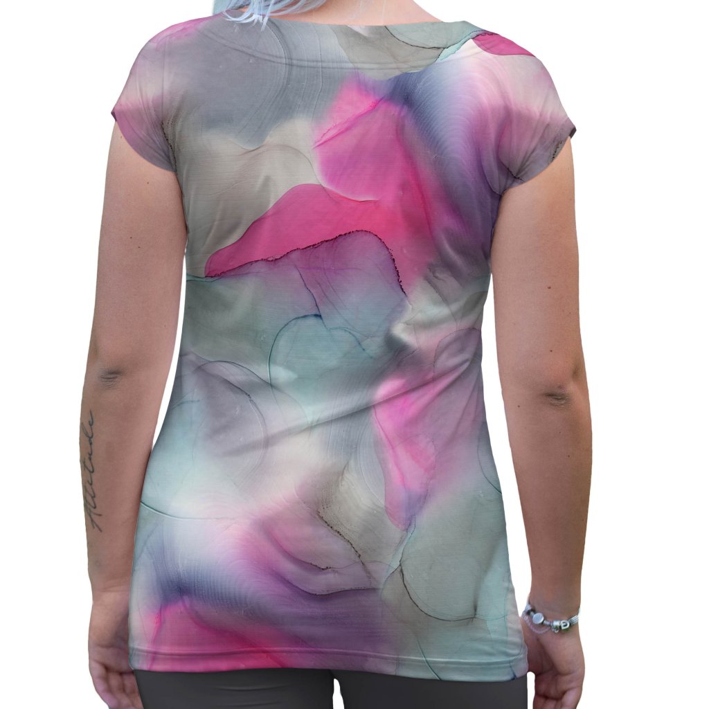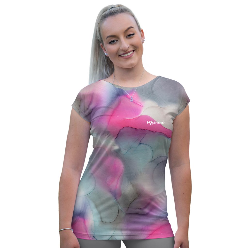 Lehké dámské tričko Mishino KARIN okouzlí jemným akvarelovým motivem v odstínech růžové, šedé a tyrkysové. Elegantní přechody barev vytvářejí dojem malby na hedvábí – ideální pro ženy, které milují ženskost, jemnost a originalitu.
